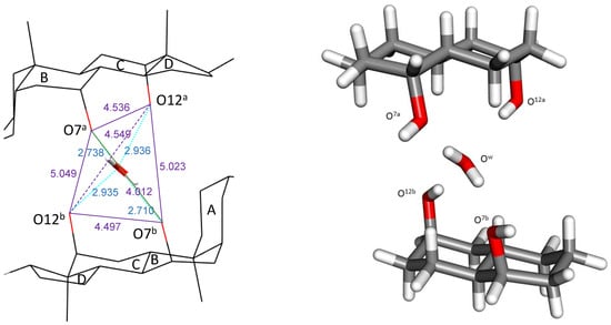 Left: Oxygen–Oxygen distances (lines and data in amethyst color) of the tetrahedron formed by the O7-H and O12-H hydroxy atoms of the two steroid residues encapsulating a water molecule located at their centroid []. The four hydrogen bonds are indicated with blue lines, as are the hydrogen bond distance values (Ow-H…O7 and O12-H…Ow). All data in Å. Right: Simplified system model.