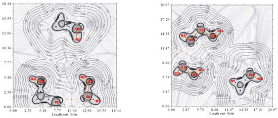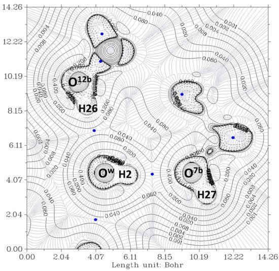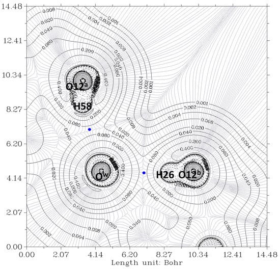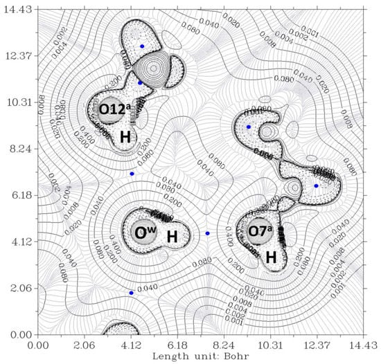 Figure 6 and Figure 7 show the contour lines at the planes defined by O7a-Ow-O12a and O7b-Ow-O12b, respectively. In both cases, Ow and O12 exhibit peanut profiles directed towards the associated acceptor atoms O7 and Ow, respectively. In all cases, the bond paths of the four hydrogen bonds link the expected two atoms, and the HBCP is indicated with a blue color point. The analysis of the data was carried out as previously. The HBCPs are identified by numbers (Figure not shown), and, for association purposes, the HBCPs of the full complex are shown in brackets. Table 2 shows the obtained results.
