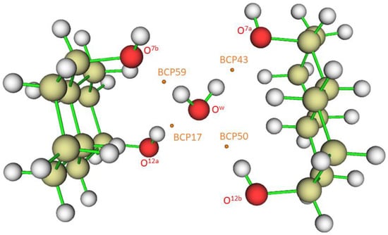 When ∇2ρ < 0, the electronic charge is locally concentrated, as in the case of covalent bonds []. When ∇2ρ > 0, the electronic charge is locally depleted [], resulting in what are called closed-shell interactions. This happens in hydrogen bonds (HB), in which the charge concentrations are separately localized in the basins of the neighboring atoms []. Figure 5 shows bond critical points where the gradient ∇ρ vanishes. Numbers 17, 43, 50, and 59, located between hydrogen and oxygen atoms, correspond to hydrogen bond critical points (HBCP), which are (3,−1) saddle points. Other numbers correspond to covalent bonds (located, for instance, between two carbon atoms).