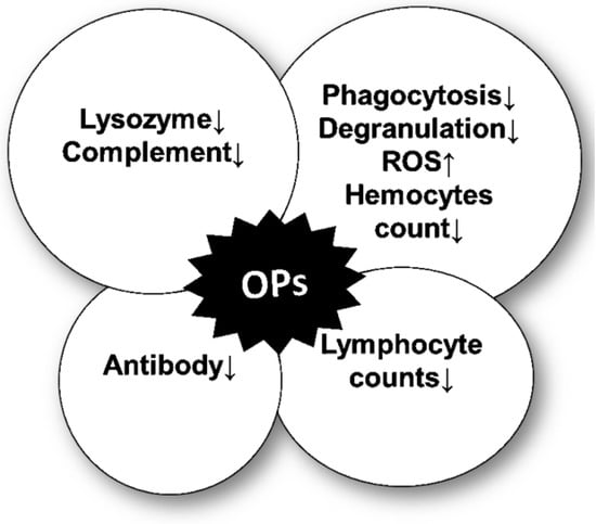 Other alterations to immune mechanisms by OPs exposure are phagocytic parameters. In line with this, malathion has a negative effect on the innate immune response (WBC, ROS production, and phagocytic activity) in C. carpio carpio []. Additionally, acute and chronic exposure to chlorpyrifos effects leukocyte phagocytic capacity [,,]. Furthermore, malathion reduces the phagocytic capacity of Murray codfish (Maccullochella peelii T. L. Mitchell) []. In addition, phagocytosis was reduced, and an ROS production increment was reported in O. niloticus exposed to diazinon [].