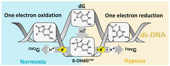 It should be noted that the cancer cells in close proximity to blood vases were well-oxygenated and that, as the distance increases, the condition of the microenvironment becomes hypoxic. The above oxygen gradient causes plasticity in the tumour cells and therefore increases their aggressive and metastatic phenotype. Additionally, an increase in the hypoxia-incubator factor can create an acidic environment, which results in tumour drug resistance, apoptosis/autophagy, various DNA damage, etc. For details, please refer to Shu and Simon’s recent and valuable work [5,6]. Moreover, dG can be also oxidized by other reactive oxygen and nitrogen species, free electrons, radiation, CO3●̶, etc. [7,8,9,10]. The 7,8-dihydro-8-oxo-2′-deoxyguanosine (OXOdG) has been identified as one of the most frequent dG lesions and is keenly studied because of its relative ease of measurement, chemical synthesis, and the different methods of its introduction into the oligonucleotide structure. The second most common dG lesion is 2,6-diamino-4-hydroxy-5-foramido-2′deoxypyrimidine (FapydG) [11]. In contrast to OXOdG, which is the predominant lesion formed in the presence of oxygen, FapydG is known to be the main lesion formed in hypoxic conditions [12]. However, in both cases, the shared intermediate 2-amino-8-hydroxy-1,7,9-thihydropurine-6-one (8-OHdGrad), which is formed in the presence of ●OH, has been noted. Depending on the condition of the medium, 8-OHdGrad can be converted into OXOdG by one-electron oxidation or FapydG by one-electron reduction, as shown in Figure 1. The above is justified by the high reaction constant of 8-OHdGrad with oxygen, i.e., k = 2 × 109 m−1s−1, while the constant of the imidazole ring-opening process has been found to be four magnitudes lower (k = 2 × 105 m−1s−1) [13].