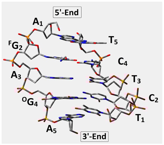 Graphical representation of d[A1FG2A3OG4A5]*[T1C2T3C4T5] optimized spatial geometry at the M06-2x/D95** level of theory in the aqueous phase using the PCM solvation model. FG: 2,6-diamino-4-hydrox-5-foramido-2′deoxypyrimidine, OG:7,8-dihydro-8-oxo-2′-deoxyguanosine.