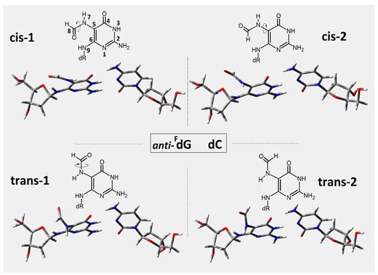 In this study, the short ds-oligonucleotide containing FapyG and OXOG was taken into consideration, i.e., d[A1FG2A3OG4A5]*[T1C2T3C4T5] (Figure 2), referred to throughout as oligo-FapyG. As mentioned in the introduction, both lesions are formed via an 8-OH-dG radical intermediate initiated by •OH activity [27]. Furthermore, because the imidazole ring is open, FapyG is, in fact, the pyrimidine that bonds to the 2-deoxyribose ring via the N9 atom (Figure 3). This indicates that the FapydG structure has a high level of conformational flexibility. Even though N9 lost its tertiary and aromatic character, FapydG was adopted in a ds-DNA anti-conformation instead of syn [18]. Additionally, as shown in Figure 3, four rotameric forms can be selected depending on rotation around the N7-C8 and C5-N7 linkages. For the energy calculation study, the base-pair’s geometries, formed by FapydG and dC, were isolated from the four optimized ds-pentamers containing the different rotameric forms of FapyG (Figure 3). All the ds-DNA spatial structures were fully optimized using Our Own N-layered Integrated Molecular Orbital and Molecular Mechanics (ONIOMs) method in the aqueous phase (please see the Materials and Method section). The comparison of calculated isolated base pair energies (M06-2x/6-31++G** in condensed phase) reveals the following order of stability: trans-2 (−1855.373892), cis-1 (−1855.373868), cis-2 (−1855.371179), trans-1 (−1855.367282), with all energies given in Hartree.