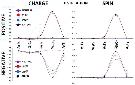 Spin and charge distribution within oligo-FaoyG calculated at the M062x/6-31++G** level of theory in the condensed phase; only the stacked base pairs were taken into consideration. VRC—vertical radical cation, VRA—vertical radical anion, NE—non-equilibrated, and EQ—equilibrated solvent–solute interaction. The charge and spin distribution of vertical and adiabatic forms. The raw data have been given in Table S2. F = Fapy, O = OXO.
