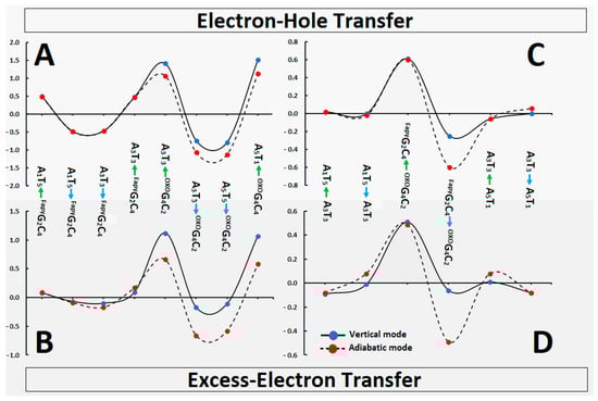 The situation is similar to the previously discussed excess–electron transfer. As presented in Figure 5 and Table S2, the difference between the adiabatic and vertical modes around FapyGC was negligible. Moreover, the ΔG value ranged from 0.09 eV to −0.09 eV. As previously, the OXOGC pair can be recognized as a sink of the excess electron, which was confirmed by the significantly negative ΔG values of A3T3→OXOG4C2, A5T1→OXOG4C2 and FapyG2C4→OXOG4C2 as follows (vertical/adiabatic mode) in [eV]: −0.17/−0.66, −0.11/−0.58, −0.06/−0.49, respectively.