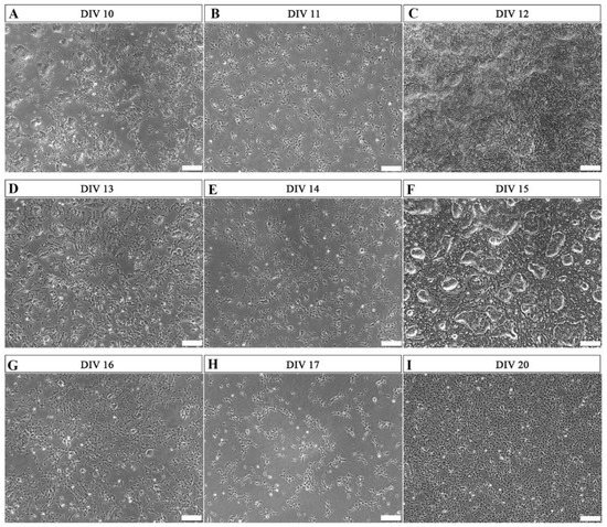 Representative phase-contrast photomicrographs of cells undergoing differentiation from hiPSCs to hiPSC-immatureSCs. Matrigel coating was used during this period. (A,D,G) show the morphology of the differentiating cells at 60–70% confluence, after 10 days in vitro (DIV 10) (A), DIV 13 (D), and DIV 16 (G), respectively. After this, cells were alternatively passaged to a lower cell density of 2 × 105 per well in a 6-well plate ((B)—DIV 11, (E)—DIV 14, (H)—DIV 17) or continuously cultured, without splitting, in high cell density ((C)—DIV 12, (F)—DIV 15, (I)—DIV 20). DIV = days in vitro. Scale bar: 200 µm.