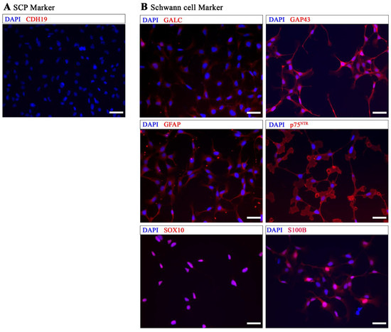 Immunocytochemistry (ICC) was used to further characterize these differentiated cells at DIV 20 using antibodies against CDH19, SOX10, p75NTR, GAP43, GFAP, S100B, and GALC (Figure 2). The ICC results demonstrated that the cells were already negative for CDH19, a marker commonly considered to be specific for SCPs (Figure 2A), and positive for Schwann cell markers SOX10, p75NTR, GAP43, GFAP, S100B, and GALC (Figure 2B).