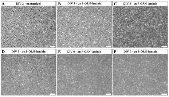 Representative phase-contrast photomicrographs of hiPSC-immatureSCs undergoing differentiation to hiPSC-SCs. hiPSC-immatureSCs cultured in MHH-SCDM after 2 days on matrigel coating ((A), DIV 2) and after the coating was changed to poly-L-ornithine (P-ORN)-laminin (B–F). Cell numbers continuously increased with a lowering pace and started showing an elongated morphology at DIV 3 (B) and DIV 4 (C). After this, cells visibly differentiated more instead of further increasing their density at DIV 5 (D). At DIV 6 (E) and DIV 7 (F), most of the cells showed an elongated morphology. Differentiation was coming to an end at DIV 7 (F), when undifferentiated cells were not observed within the cultures. Scale bar: 200 µm. MHH-SCDM = Schwann cell differentiation medium as composed by the MHH team.
