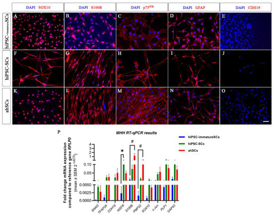 Comparative immunocytochemistry on hiPSC-immatureSCs, hiPSC-SCs and adult human Schwann cells (ahSCs). Schwann cell markers SOX10, S100B, p75NTR, and GFAP were detected in hiPSC-immatureSCs (A–E), hiPSC-SCs (F–H,I,J) and ahSCs (K–O). All cells were negative for CDH19 (E,J,O). Cell nuclei were stained with DAPI (Blue). Scale bar: 50 µm. (P) MHH results of quantitative RT-qPCR for SNAI2, TFAP2A, CDH19, NGFR, S100B, PMP22, SOX10, c-Jun, PLP1, and GAP43 in hiPSC-immatureSCs, hiPSC-SCs and ahSCs. Values were normalised to the reference gene RPLP0. Statistical analysis with non-parametric Kruskal–Wallis test followed by Dunn’s multiple compansons test, * p < 0.05 hiPSC-immatureSCs vs. hiPSC-SCs; # p < 0.05 hiPS-immatureSCs vs. ahSCs. n = 3 cell cultures.