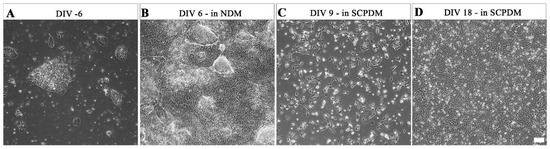 At UCL, hiPSCs were maintained in distinct colonies (Figure 5A). These hiPSCs began to proliferate rapidly once the media was changed from Essential 8 flex media to antibiotic free neural differentiation media (NDM, Figure 5B). Between 6 days in vitro (DIV 6) and then DIV 18 in antibiotic free SCPDM, the cells became evenly dispersed over the GeltrexTM coated culture vessels and densely populated the surface (Figure 5C,D). The hiPSC-SCPs (precursor stage) has been determined by [25] to be reached at DIV 18 in antibiotic free SCPDM (Figure 5D).