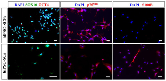 Immunocytochemistry images of UCL hiPSC-SCPs and hiPSC-SCs from low-density plated hiPSC-SCPs. Both cell types were positive for SOX10 (green) and p75NTR (red). Only hiPSC-SCs were positive for S100B (red) while both were negative for OCT4 (red). DAPI was used to stain the nuclei (blue). Scale bar = 20 µm (hiPSC-SCPs), 50 µm (hiPSC-SCs).