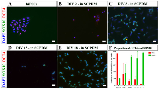 As the cells differentiated from hiPSCs to hiPSC-SCPs (Figure 7), the change from hiPSCs growing in colonies to more dispersed cells occured early on once the media was changed from Essential 8 Flex media to antibiotic free NDM and SCPDM (Figure 7B). Furthermore, the proportion of cells positive for OCT4 reduced while the number of SOX10 positive cells increased over time, reaching close to 100% at DIV 18 in SCPDM (Figure 7E,F).