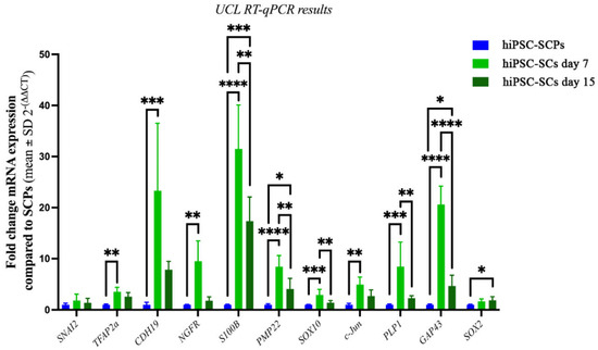 UCL RT-qPCR results showing fold change in mRNA expression in hiPSC-SCs after 7 (light green) or 15 days in SCDM (dark green) compared with hiPSC-SCPs (blue), which was set at 1. Shapiro–Wilks normality test followed by either one-way ANOVA with Tukey’s post-comparison test, * p < 0.02, ** p < 0.004, *** p < 0.0005, **** p < 0.0001 or Kruskal–Wallis with Dunn’s multiple comparison post-hoc test for non-normal distributions (SNAI2, TFAP2A, CDH19, NGFR, c-Jun), * p = 0.039, ** p <0.003, *** p = 0.0003. n = 3 in duplicate, mean ± SD. All were normalised to the reference genes TBP and RPS18.