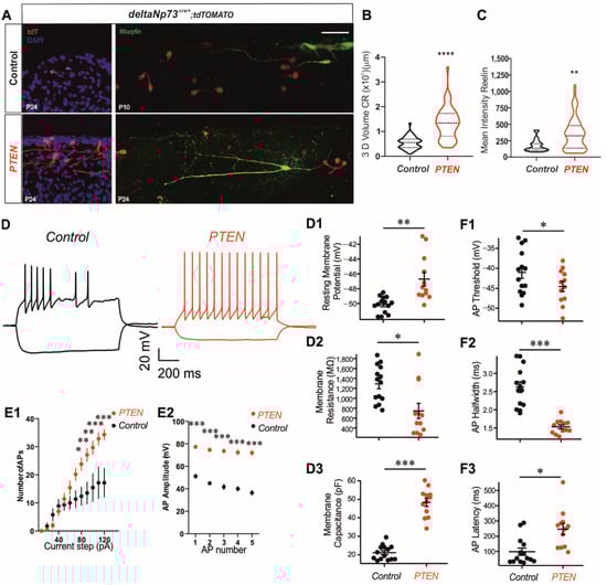 19]. Here, we investigated the role of the PI3K/AKT/mTOR pathway in the cell death of CRs derived from the ΔNp73 lineage, which includes 80% of all CRs in the neocortex. We show that this pathway is physiologically inhibited at the postnatal stage in CRs before they start to die through apoptosis. We then sustained its activation using a genetic approach to prevent CRs from death. Both gain and loss-of-function approaches of PI3K or PTEN, respectively, led to CR survival, whereas the activation of the mTOR pathway by TSC1 removal had little effect on the cell numbers. As expected for the activation of this pathway, the morphology and the intrinsic properties of the survival CRs were altered, but these cells were still active and expressed more Reelin in an overall preserved cortex. PTEN loss-of-function in ΔNp73-derived CRs reduced Reelin N-terminal cleavage in the cortex of young animals, leading to an increase in the full-length fraction with no change in the mTOR activity in the pyramidal neurons underneath. Finally, the persistence of CRs in layer I of the cortex did not alter the general behavior of the