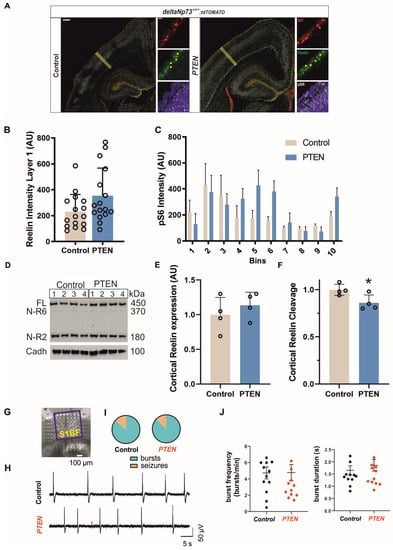 Cortices from the Pten and control mice (n = 4) were dissected from the brain at P7–P8 and snap-frozen in liquid nitrogen before extraction in RIPA buffer (ref: #R0278; Sigma-Aldrich (Saint-Louis, MI, USA) with protease (ref: #04693116001; Roche (Bâle, Switzerland) and phosphatase (ref: #5870; Cell Signaling (Danvers, MA, USA)) inhibitors. Following this, 25 µg of the total protein extracts were run on a 3–8% Tris–acetate gradient gel (NuPAGETM, Ref: #EA03785BOX; Invitrogen (Waltham, MA, USA)) and transferred to nitrocellulose membrane (ref: #GE10600002, AmershamTM ProtanTM, Sigma-Aldrich (Saint-Louis, MI, USA)) before overnight incubation with primary antibodies (mouse anti-Reelin G10 (1:500; MAB5364; Millipore (Burlington, MA, USA), mouse anti-pan Cadherin (1:1000; C1821; Sigma-Aldrich (Saint-Louis, MI, USA)) in a Tris buffer (0.1M; pH:8) sodium (1.5M) Tween 20 (0.05%) (TBST) solution containing 5% fat-free milk. After 45 min of incubation with horseradish peroxidase conjugated mouse secondary antibodies (1/20.000, ref: # 115-035-008; Jackson ImmunoResearch (Cambridge, UK)) and three washes in TBST, the membranes were incubated in chemiluminescent substrate (Super Signal Pico Plus ref: #34580; Thermo Fisher Scientist (Waltham, MA, USA)) before exposition and signal acquisition under a digital camera (ChemidocTM Touch Imaging System; Bio-Rad (Hercules, CA, USA). Signal intensities were analyzed using Image Lab Software (V6.1; Bio-Rad, (Hercules, CA, USA)). The Reelin expression (sum of full-length, NR-6, and NR-2 intensities) was normalized to pan-Cadherin and its cleavage products to total Reelin (sum of NR-6 plus NR-2 normalized to sum of full-length, NR-6, and NR-2).