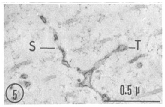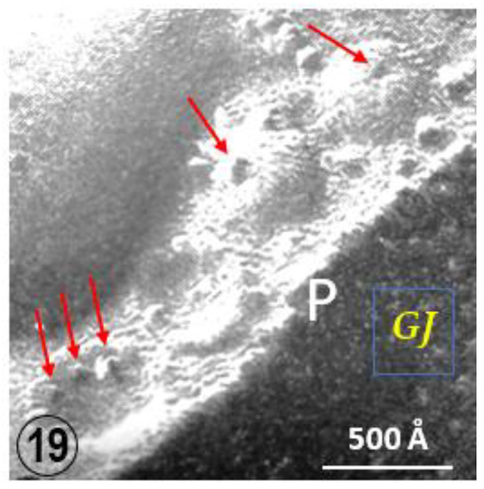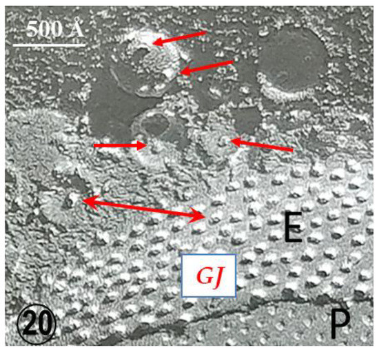 - Hanna, R.B.; Keeter, J.S.; Pappas, G.D. The fine structure of a rectifying electrotonic synapse. J. Cell Biol. 1978, 79, 764–773. [Google Scholar] [CrossRef]