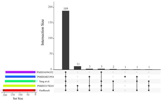 Visualization of intersecting sets in our and four previous genome-wide identifications of R2R3-MYB genes in P. trichocarpa. Our result for the poplar R2R3-MYB family identification is represented by the red horizontal bar. The other four articles—PMID: 34594352 (https://pubmed.ncbi.nlm.nih.gov/, accessed on 1 May 2022) [], PMID: 24821954 (https://pubmed.ncbi.nlm.nih.gov/, accessed on 1 May 2022) [], Yang et al. [], and PMID: 33178243 (https://pubmed.ncbi.nlm.nih.gov/, accessed on 1 May 2022) []—are colored in pink, blue, green, and yellow, respectively. The matrix layout shows all intersections of five R2R3-MYB identification sets. Black solid points in the matrix denote sets that are intersecting.