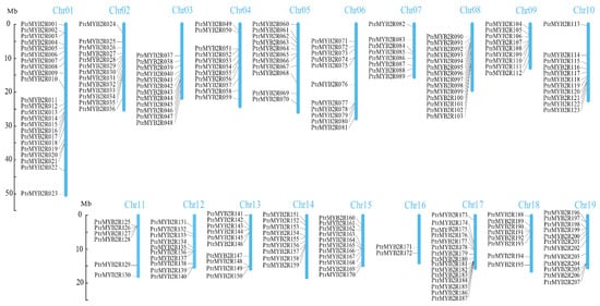 Distribution of PtrMYB2R genes on the 19 poplar chromosomes. The 19 chromosomes of P. trichocarpa are represented by the blue vertical bars, and their chromosome numbers are at the top of the chromosomal bars. A total of 207 R2R3-MYB genes are distributed over the P. trichocarpa chromosomes. The chromosomal scale bar is 10 Mb.
