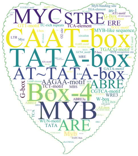 Cis-acting elements are closely related to specific biological functions and may participate in the regulation of gene expression. Hence, we analyzed the cis-acting elements in the promoter upstream of all the PtrMYB2R genes (Figure 3). The promoter region of the PtrMYB2R genes had the highest number of cis-elements involved in abiotic stress, including MYB, MYC, STRE (stress response elements), ABRE (ABA-responsive element), TATA-box, G-box, W-box, and MBS (MYB-binding sites). In addition to STRE, which is involved in osmotic stress and heat shock, other cis-acting elements can bind to transcription factors (e.g., MYB, WRKY, and DREB) to regulate the biological process of the plant response to drought stress [,]. We also found that there were many light response elements (Box-4) and oxidation defense elements (e.g., ARE (antioxidant response element), CGTCA motif, and AAGAA motif) [,]. In addition, there were some cis-elements related to plant hormone biosynthesis, which were mainly involved in the biosynthesis of MeJA (CAAT-box, CGTCA-motif, and TGACG-motif), ethylene (ERE, ethylene response element), and salicylic acid (TCA element, salicylic acid-responsive elements) [,]. Thus, the number of cis-acting elements in the promoter region of the R2R3-MYB genes was large and rich in variety (Table S3).