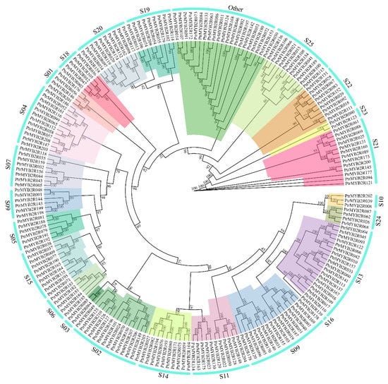 To better understand the evolutionary relationship between poplar R2R3-MYB genes, we constructed an unrooted ML (maximum likelihood) tree using all the poplar R2R3-MYB proteins. More than 90% of branches in the ML tree had a bootstrapping value of more than 80%, indicating the reliability of subgroup classification (Figure 4). All 210 R2R3-MYB proteins in the entire P. trichocarpa genome were distinctly divided into 23 subgroups, the S16 subgroup of which had only one gene member. However, unlike in the study of Zhao et al. [], there was no S12 subgroup in our gene family classification result. Based on the bidirectional best hits (BBH) between 210 PtrMYB2R genes and the AthR2R3-MYB genes, no PtrMYB2R genes were found to be homologous to the AthR2R3-MYB genes belonging to the S12 subgroup. In addition, a total of 21 R2R3-MYB genes were clustered together in a single cluster, and they shared high sequence similarity with AtR2R3-MYB genes in nine subgroups. However, they were not classified into any of the known subgroups in A. thaliana and were thus assigned to the subgroup “Other”.