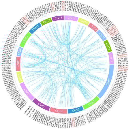 Collinearity analysis of poplar R2R3-MYB genes. The outer circle shows the chromosomal distribution of these R2R3-MYB genes. The tandem duplicated genes on the outer circle are marked in red. The duplicated gene pairs are indicated by blue lines in the inner ring.