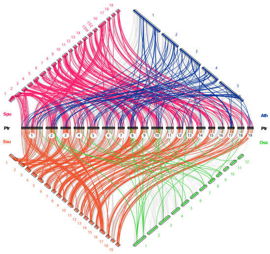 The interspecific collinearity analysis of R2R3-MYB genes in poplar and four different species. The chromosomes of the P. trichocarpa, S. purpurea, S. suchowensis, A. thaliana and O. sativa genomes are marked in black, pink, orange, blue, and green, respectively. The collinearity blocks between P. trichocarpa and other four plant species are marked by gray lines.