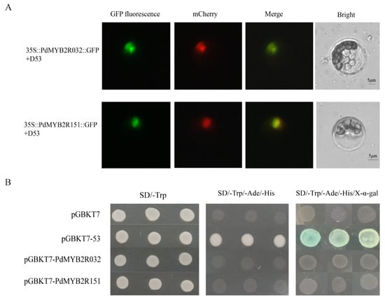 Subcellular localization and autoactivation activity of PdMYB2R032 and PdMYB2R151 proteins. (A) Subcellular localization. mCherry-D53, a red and nuclear-localized marker. Scale bar: 5 μm. (B) Analysis of autoactivation activity. pGBKT7 vector was the negative control, and pGBKT7-53 vector was the positive control. Yeast cells were grown on SD medium at 29 °C for 48 h.