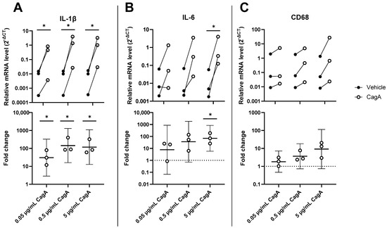 H. pylori virulence factor cytotoxin-associated gene A (CagA) upregulates expression of pro-inflammatory genes in coronary artery smooth muscle cells (CASMCs). mRNA levels of IL-1β (A), IL-6 (B), and CD68 (C) were analyzed by qPCR in CASMCs following stimulation with CagA. n = 3 with paired vehicle controls. Upper panels display relative expression to glyceraldehyde 3-phosphate dehydrogenase (GAPDH) calculated as 2−ΔCT. Lower panels show fold change with mean and 95% confidence intervals. * p < 0.05 vs. vehicle control (paired t-test).