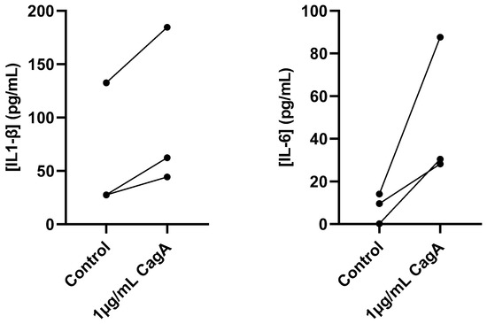 To further characterize the inflammatory response to CagA in CASMCs, secreted pro-inflammatory cytokines were quantified using ELISA in cell culture medium following treatment with 1 µg/mL CagA (Figure 2). Both IL-1β and IL-6 showed higher concentrations after CagA incubation, but the difference did not reach statistical significance (IL-1β, mean concentration of 68.3 pg/mL for control vs. 91.6 pg/mL for CagA treatment, p = 0.08; IL-6, mean concentration of 8.0 pg/mL for control vs. 48.8 pg/mL for CagA treatment, p = 0.13). Although cells from one donor showed higher baseline concentrations of IL-1β in the control group (133 pg/mL), than cells from the other donors CagA treatment further increased the IL-1β level to 185 pg/mL.