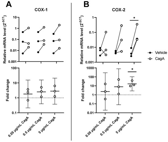 Cytotoxin-associated gene A (CagA) induces the cyclooxygenase (COX) pathway in coronary artery smooth muscle cells (CASMCs). Expression levels of prostanoid-synthesizing enzymes COX-1 (A) and COX-2 (B) were analyzed by qPCR following stimulation of CASMCs with CagA. n = 3 samples with paired vehicle controls. Upper panels display relative expression to glyceraldehyde 3-phosphate dehydrogenase (GAPDH) calculated as 2−ΔCT. Lower panels show fold change with mean and 95% confidence intervals. * p < 0.05 vs. vehicle control (paired t-test).