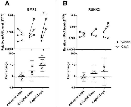 To explore the effect of CagA on vascular calcification, mRNA levels of Runt-related transcription factor 2 (RUNX2) and bone morphogenetic protein 2 (BMP2) were analyzed in CASMCs. Both mRNAs were increased in a dose-dependent way to the CagA challenge (Figure 4). BMP2 was significantly upregulated by 5 µg/mL CagA treatment (mean fold change 8.6, 95% CI 2.5 to 28.9, p = 0.02). RUNX2 was upregulated at the higher CagA concentrations tested but did not reach statistical significance.