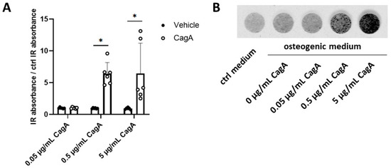 Cells from n = 3 biological replicates were measured in quadruplicate technical replicates repeated two times to assess calcification as previously described [43]. An amount of 6000 cells per well were seeded in black 96-well plates and cultured for 6 days in osteogenic medium consisting of DMEM supplemented with 5% FBS, 100 units/mL penicillin, 100 μg/mL streptomycin, 2.5 µg/mL Amphotericin B, 1 mM sodium pyruvate, 10 mM HEPES, 2 mM l-glutamine, and 2.6 mM inorganic phosphate (Pi) to facilitate calcification, or in regular medium as non-osteogenic control. CagA or vehicle (50% glycerol and 50% tris-buffer) was added to the osteogenic medium at the indicated concentrations. After 5 days of culture, 10 nM IRDye 800CW BoneTag Optical Probe was added to the medium and incubated for another 24 hours. Following incubation, wells were rinsed twice with PBS and then filled with 150 µL of PBS. Calcification was then assessed qualitatively and quantitively using the imaging platform Odyssey CLx (LI-COR Biosciences, Lincoln, NE, USA). Calcification was quantified as arbitrary units of intensity and normalized to the intensity of the osteogenic control for each donor.