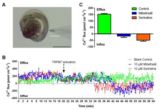 To determine whether the TRPM7 channel triggered larval settlement through the Ca2+ signal, the Ca2+ flux was measured before and after larvae exposure to 10 μM sertraline or mibefradil. Non-invasive micro-test technology (NMT, Xuyue (Beijing, China)) was employed to measure the concentration gradient of Ca2+ between the two predetermined points by using a corresponding microsensor (Figure 1A). The Ca2+ microsensor was calibrated in 1.0 mM and 0.1 mM Ca2+ beforehand. The early settled larvae of M. sallei were washed once with the testing liquid (360 mM NaCl, 2.0 mM NaHCO3, 8.0 mM KCl, 0.1 mM Na2SO4, 0.5 mM CaCl2, pH 8.1). The testing samples were measured in the measuring chamber containing 3 mL testing liquid with or without TRPM7 channel activators (10 μM), and a Ca2+ flux microsensor was positioned near the edge of the shell (approximately 3 μm), before the Ca2+ signals were detected. Ca2+ flux data were exported from imFluxes V2.0 software.