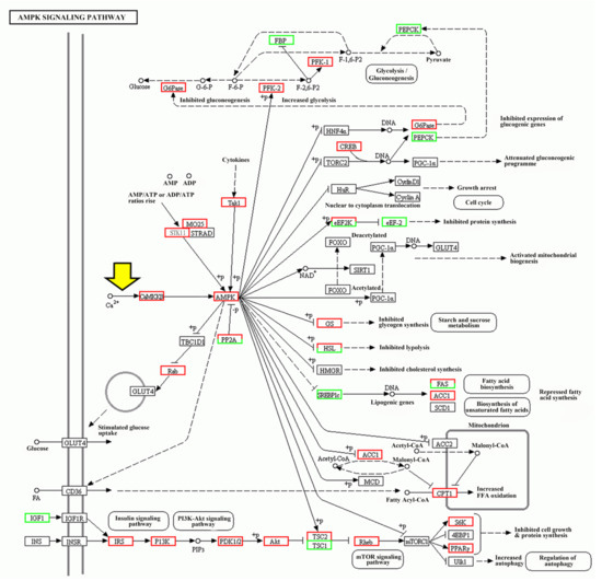 AMP-activated protein kinase (AMPK) signaling pathway (ko01522) constructed based on the KEGG pathway analysis for settled larvae vs. pediveliger larvae. Red and green boxes represent the genes that were upregulated and downregulated, respectively. Mixed colored boxes indicate that there were several genes annotated including upregulated (red) and downregulated genes (green). The thick yellow arrow indicates that intracellular Ca2+ can activate the CaMKKβ-AMPK pathway.