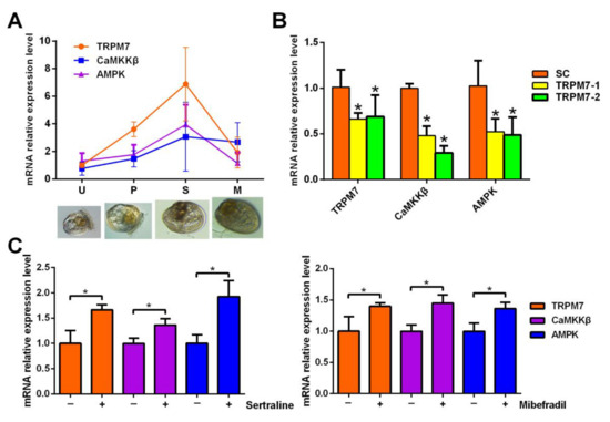 Genes expression of the TRPM7 channel associated with CaMKKβ/AMPK at the mRNA level. (A) Relative expression levels of TRPM7, CaMKKβ, and AMPK during larval development. U: umbone larvae. P: pediveligers; S: settled larvae; metamorphosed larvae. (B) Relative expression level of TRPM7 associated with CaMKKβ/AMPK after larvae exposure to siRNA against TRPM7 for 12 h. SC: solution control, 2 μL mL−1 lipofectin. * Denotes a significant difference between the treatments and the control (p < 0.05, Dunnett’s test). (C) Relative expression level of TRPM7 associated with CaMKKβ/AMPK after larvae exposure to the TRPM7 channel activators for 12 h. * Denotes a significant difference between the treatments (p < 0.05, Student’s t-test). Data are indicated as the mean ± SD from triplicate experiments.