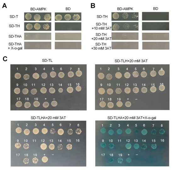 The vectors pGBKT7-AMPK and pGBKT7 were transformed into the AH109 yeast strain, and the transformants were cultured on SD/-Trp, and SD/-Trp-X plates to detect the auto-activation activity. The colonies containing the pGBKT7 plasmid on SD/−Trp appeared, but did not on the SD/-Trp-X plates (Figure 4A) while the colonies containing the pGBKT7-AMPK plasmid on the SD/−Trp and SD/-Trp-His plates appeared, indicating that pGBKT7-AMPK had activity of auto-activation. To inhibit the auto-activation, different concentrations of 3-aminotriazole (3AT) were added to the SD/-Trp-X plates. This showed that the pGBKT7-AMPK colonies on the SD/-Trp-His plates containing 20 mM 3AT disappeared (Figure 4B), indicating that there was no activity of auto-activation. Thus, the pGBKT7-AMPK bait plasmid was qualified to be adopted in the next Y2H assay on SD/-Trp-X plates containing 20 mM 3AT.