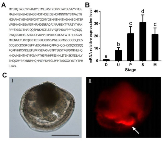 Temporal and spatial expression patterns of Silk gland factor 1 (SGF1). (A) The deduced amino acid sequence of SGF1. (B) Expression of SGF1 during larval development at the mRNA level. Different letters above the bars denote significant differences among treatments (p < 0.05, Tukey’s test). D: D-shaped veligers; U: umbone larvae; P: pediveligers; S: settled larvae; M: metamorphosed larvae. (C) Tissue localization of SGF1 in settled larva. I is the bright field picture; II is the fluorescent field picture of I. Arrow indicates foot. Scale bar: 100 μm.