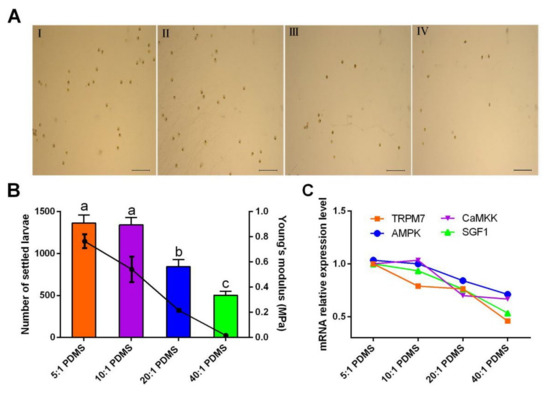 Larval responses to substrates with different stiffness. (A) Micrographs show the larval settlement on different PDMS substrates. I, II, III, and IV are the 5:1, 10:1, 20:1, and 40:1 PDMS substrates, respectively. Scale bar: 2 mm. (B) Number of settled larvae on different PDMS substrates. The line graph indicates the stiffness of different PDMS substrates expressed by the Young’s modulus. Different letters above the bars denote significant differences among treatments (p < 0.05, Tukey’s test). (C) Gene expression difference in response to different PDMS substrates. 5:1, 10:1, 20:1, and 40:1 PDMS indicate the weight ratios of the silicone elastomer base and the cross-linker in the PDMS substrates.