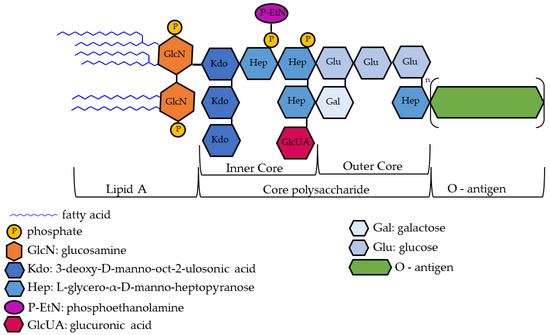 Exemplary drawing of lipopolysaccharide (LPS) structure. For details on LPS structure and regulatory steps in its biosynthesis, see [13].