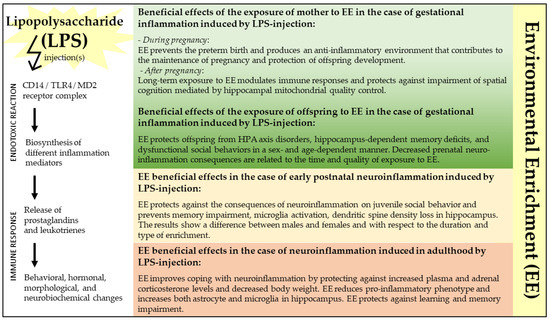 Based on the above, the purpose of this review is to describe the effects that EE paradigms can bring in counteracting LPS-induced neuroinflammation, throughout the lifespan, tested in preclinical murine models.