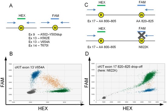 Principle of a wildtype (WT)/mutation probe assay and the „drop-off“ assay. (A,B) For the substitution mutations (here exemplary cKIT exon 13 V654A), a HEX-labeled probe binds to the WT strand (green) and a FAM-labeled probe binds to the mutant strand (blue). Double positive droplets (orange) contain both WT and mutant DNA. (C,D) In case of heterogenous cKIT exon 17 (here exemplary N822K), a HEX-labeled reference probe binds to both the WT and mutated strands, while the FAM-labeled hotspot drop-off probe only binds to the WT, thus resulting in a double-positive signal for the WT ((D), green) and a single-positive signal for the mutant ((D), blue). A small number of droplets lies in between (orange), corresponding to WT- and mutant-DNA-containing droplets, which show less FAM signal.