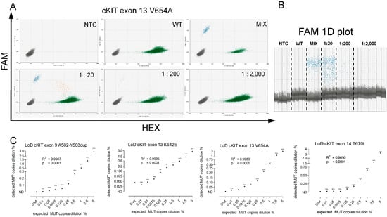 Dilution series made to determine the test sensitivity/Limit of Detection (LoD). (A) Decreasing amounts of mutant genomic DNA were added to a fixed copy number of wildtype (WT) human DNA to determine the assay’s ability to reliably detect the target of interest (here shown for cKIT exon 13 V654A). No-template-control (NTC) and WT-DNA-containing wells were run in parallel to exclude unspecific, i.e., false positive binding. (B) Dilution series in the 1D plot (depicting only the FAM = mutant signal). (C) Determination of the LoD for cKIT exon 9 A502-Y503dup, cKIT exon 13 K642E and V654A, and cKIT exon 14 T670I. Asterisks indicate the dilution where a two-folded t-test compared to NTC or WT resulted in a significant value (* p < 0.05, ** p < 0.01, *** p < 0.001). The minimal significant detected ratio was defined as LoD. R2 indicates the regression coefficient yielded by regression analysis.