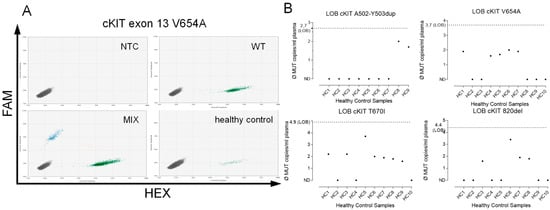 Measurements of plasma from healthy controls, taken to determine the Limit of Blank (LoB). (A) cfDNA isolated from plasma specimens from healthy subjects was measured to determine the LoB. The example shows cKIT exon 13 V654A (green and blue dots indicate WT or mutant fragment signal, respectively). Thus, a threshold to distinguish true positive droplets from unspecific or background (i.e., false positive) signals was determined. (B) Determination of the LoB as shown for cKIT exon 9 A502-Y503dup, cKIT exon 13 K642E and V654A, and cKIT exon 14 T670I. The LoB (dotted line) for each assay was calculated as the sum of the mean of all measured values plus three times the standard deviation.