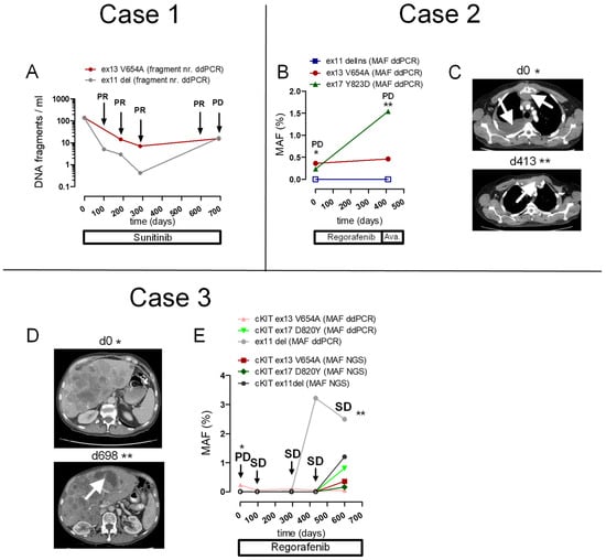 This patient had a duodenal GIST with initial hepatic metastases. Tissue analysis revealed a cKIT exon 11 deletion (V559delinsN). After imatinib treatment, the patient received sunitinib because of progressive liver metastases. After 30 months of sunitinib treatment, the patient experienced progressive liver, osseous, and mediastinal metastases (≙d0 in Figure 4B,C). A hemihepatectomy was conducted, and Sanger sequencing of tumor tissue demonstrated the previously known cKIT exon 11 deletion, a novel cKIT exon 13 V654A mutation, and WT sequences for cKIT exon 9 and 17. Therapy with regorafenib was started. At day 413, the patient was switched to avapritinib because of mediastinal and thoracic wall progression (Figure 4C, lower panel, arrow). Eight months later, the patient experienced further progression of osseous and liver metastases. A rechallenge to sunitinib was initiated. However, metastatic liver lesions further progressed and Sanger sequencing from a liver biopsy yielded previously known mutations in cKIT exon 11 and 13 in addition to a cKIT exon 17 Y823D mutation. The University Medical Center Freiburg Molecular Tumor Board recommended therapy with ripretinib. However, the patient did not receive further therapy and succumbed to the progressive, metastatic GIST. Importantly, in addition to the V559delinsN and V654A exchanges, ddPCR detected the cKIT exon 17 Y823D mutation in cfDNA isolated from plasma samples taken one and two years before this mutation was detected in the liver specimen, with increasing fragment numbers and MAF (Figure 4B).