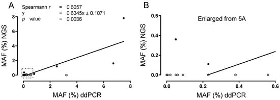 We next correlated mutant allele frequencies (MAF) obtained by NGS with those obtained by ddPCR for matched time points using data from the present study and the previous [] (Supplementary Materials Table S3). The NGS MAF correlated well with the results from ddPCR (Figure 5A,B). Particularly, we examined matched samples for two mutations in patient #1 (exon 11 deletion and exon 13 V654A) and three mutations in patient #3 (exon 11 deletion, exon 13 V654A, and exon 17 D820Y) using ddPCR and NGS (Supplementary Materials Table S3, Figure 4E). Comparison of NGS and ddPCR results showed a highly significant correlation (ρ = 0.6047; p = 0.0036; Figure 5A,B). MAF values of ctDNA assessed with NGS were generally lower than values assessed with ddPCR (mean 1.07% [SD 2.13] for ddPCR vs. mean 0.54% [SD 1.68] for NGS; Supplementary Materials Table S3). For 16/21 data time points, MUT ctDNA was detectable with ddPCR, whereas NGS was able to detect a MUT signal in only 6/21 data time points (Figure 4A,E and Figure 5A,B; Supplementary Materials Table S3).