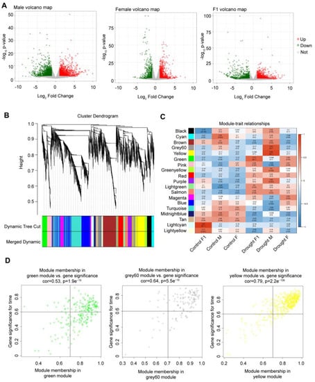 Screening of candidate genes for drought stress. (A) Volcano maps of F1, male, and female parents. Green and red represent downregulated genes and upregulated genes, respectively. (B) Hierarchical clustering diagram according to weighted gene co-expression network analysis modules. (C) Module–feature relationship. (D) Genes with high correlation coefficients in key modules (gene significance time > 0.6, module membership > 0.7).