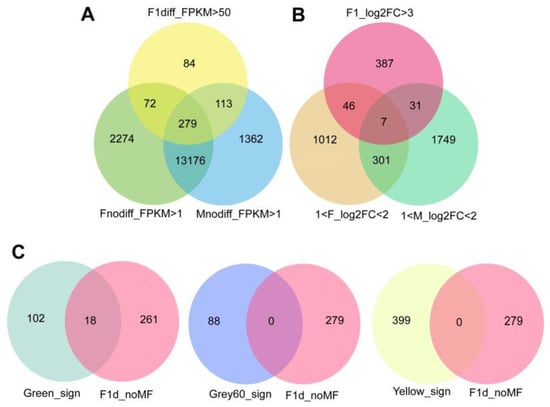 Screening candidate genes for heterosis. (A) Genes were expressed in the parents, but more were expressed in the hybrid. (B) DEGs in the parents, with increased differential fold in the hybrid. (C) Genes associated with both drought stress and heterosis.