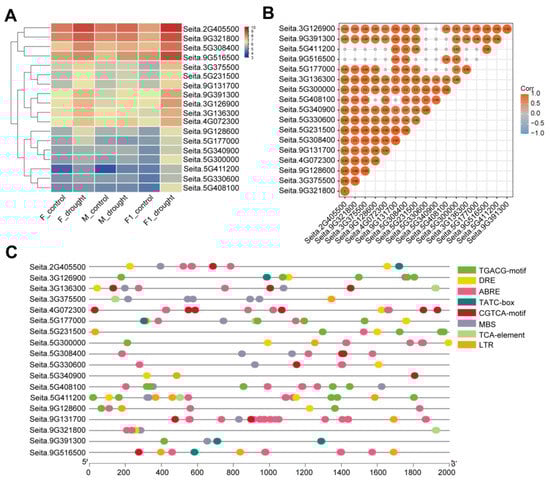 After drought stress, the 18 drought-resistant and heterosis-related genes were upregulated and highly expressed in Zhangza 19, compared with their parents, with Seita.2G405500, Seita.9G321800, Seita.5G308400, and Seita.9G516500 having the highest expression levels (Figure 3A). Further confirmation of the correlation between these 18 genes (in Figure 3B, grey dots indicate that the genes are not correlated with each other, and the size of the values represents the size of the correlation) showed that 9 genes (Seita.5G300000, Seita.5G308400, Seita.5G231500, Seita.9G131700, Seita.2G405500, Seita.9G321800, Seita.3G126900, Seita.3G136300, and Seita.3G375500) were more strongly correlated with each other. Cis-acting element analysis of the upstream 2 kb genomic DNA sequences of these 18 genes revealed that 9 of them (Seita.2G405500, Seita.3G136300, Seita.5G17700, Seita.5G308400, Seita.5G330600, Seita.5G408100, Seita.5G411200, Seita.9G131700, and Seita.9G321800) have drought-responsive elements ABRE and MBS in the promoter regions (Figure 3C). Seita.2G405500, Seita.9G321800, and Seita.5G308400 were highly expressed after drought stress and had ABRE elements; they were therefore selected as candidate genes for further analysis.