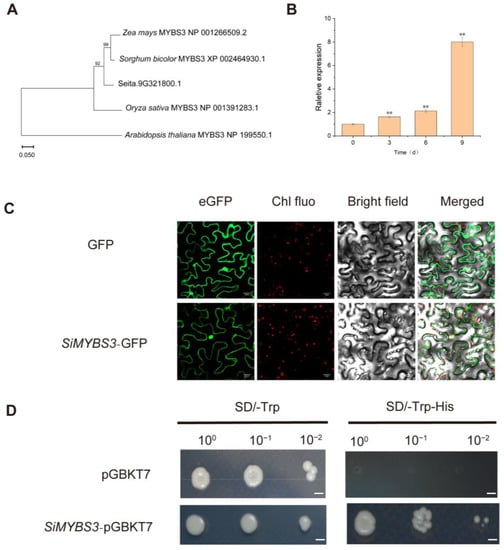 Among the three candidate genes, Seita.9G321800 encoded an MYB TF family member and showed high similarity to maize, rice, and sorghum MYBS3 genes (Figure 4A). As the rice MYBS3 gene was known to be associated with abiotic stress, we chose Seita.9G321800 as a candidate gene for further research and named it SiMYBS3.
