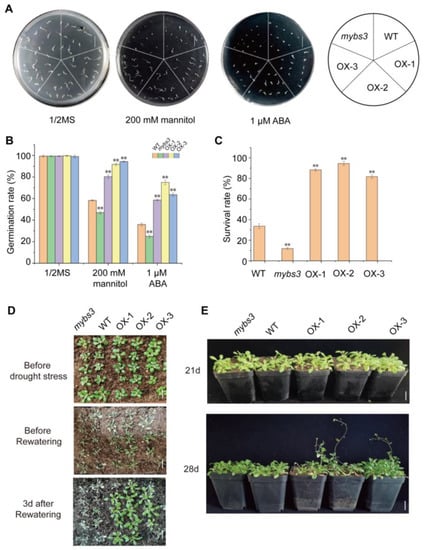 Homozygous Arabidopsis transformants were produced using the floral dip method [] and positive lines were identified as described in a previous study []. Seeds of wild-type Arabidopsis Col-0, third-generation overexpression lines, and mybs3 mutants were spotted on plates containing ½ MS, 200 mM mannitol, and 1 µM abscisic acid (ABA) for germination experiments. Average germination rates were recorded after 3 d of vernalization at 4 °C and 3 d of normal light. To further investigate the drought tolerance of transgenic Arabidopsis, 15-day-old seedlings were subjected to natural drought stress (without watering) for one week and re-watered after drought stress, and survival rates were recorded 3 d after re-watering.